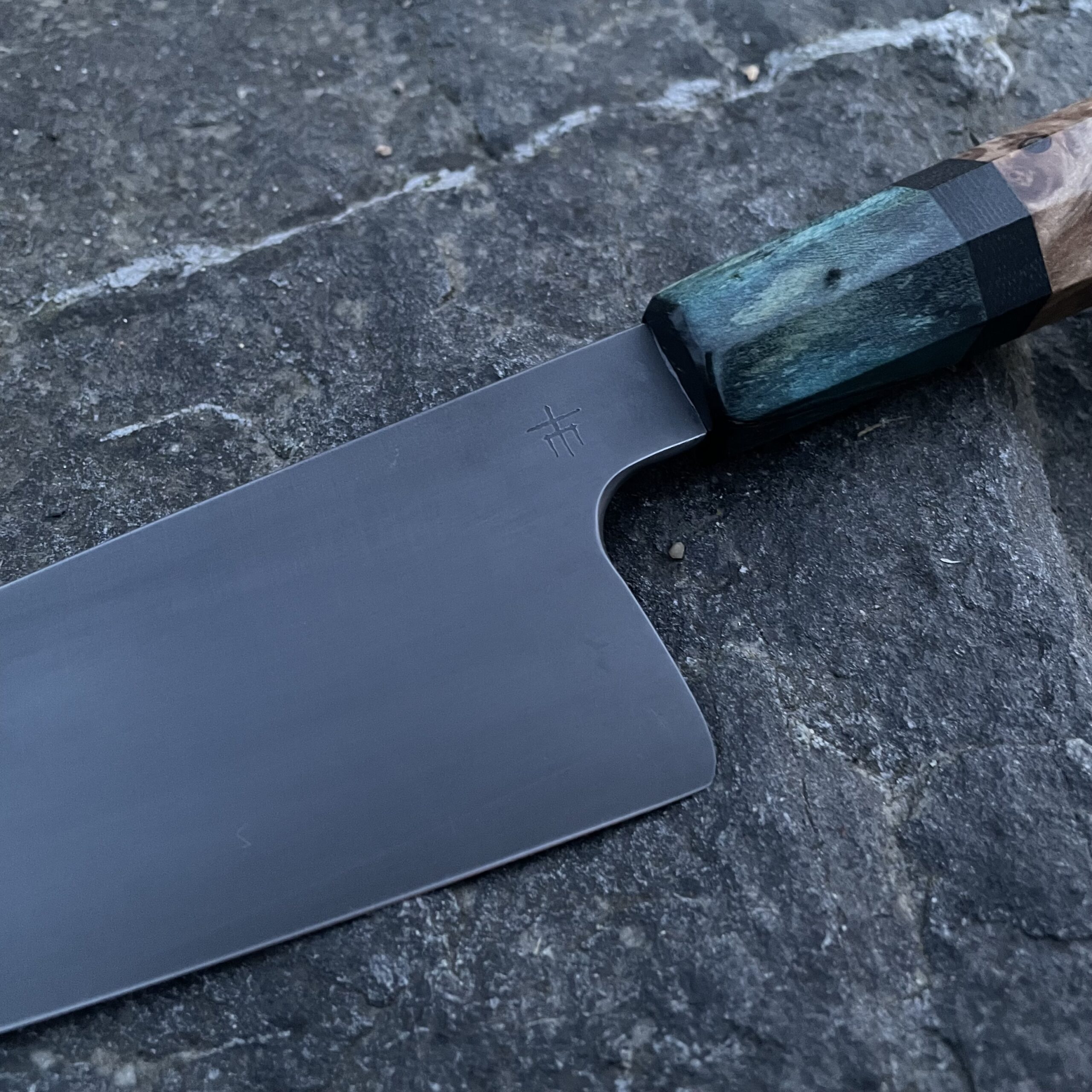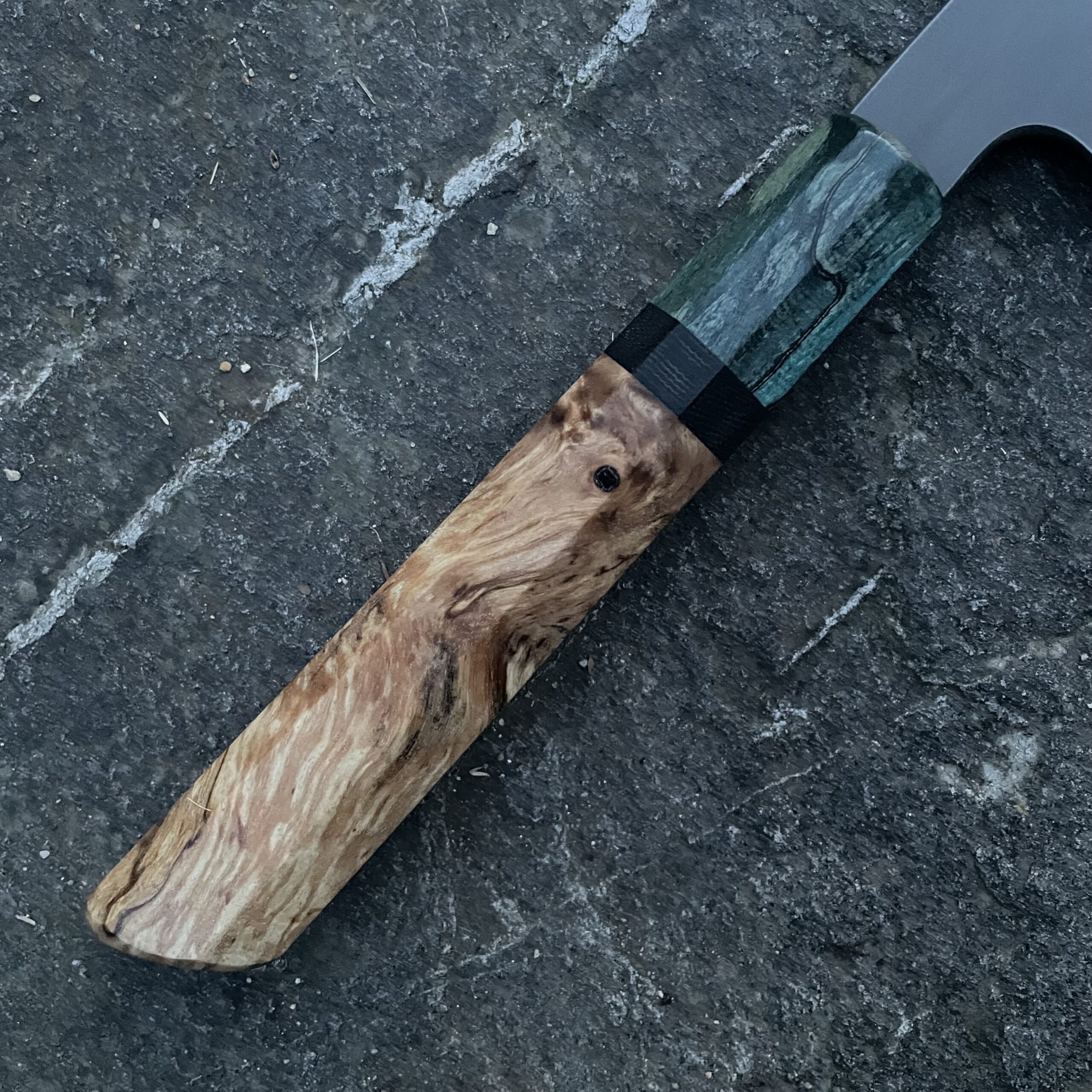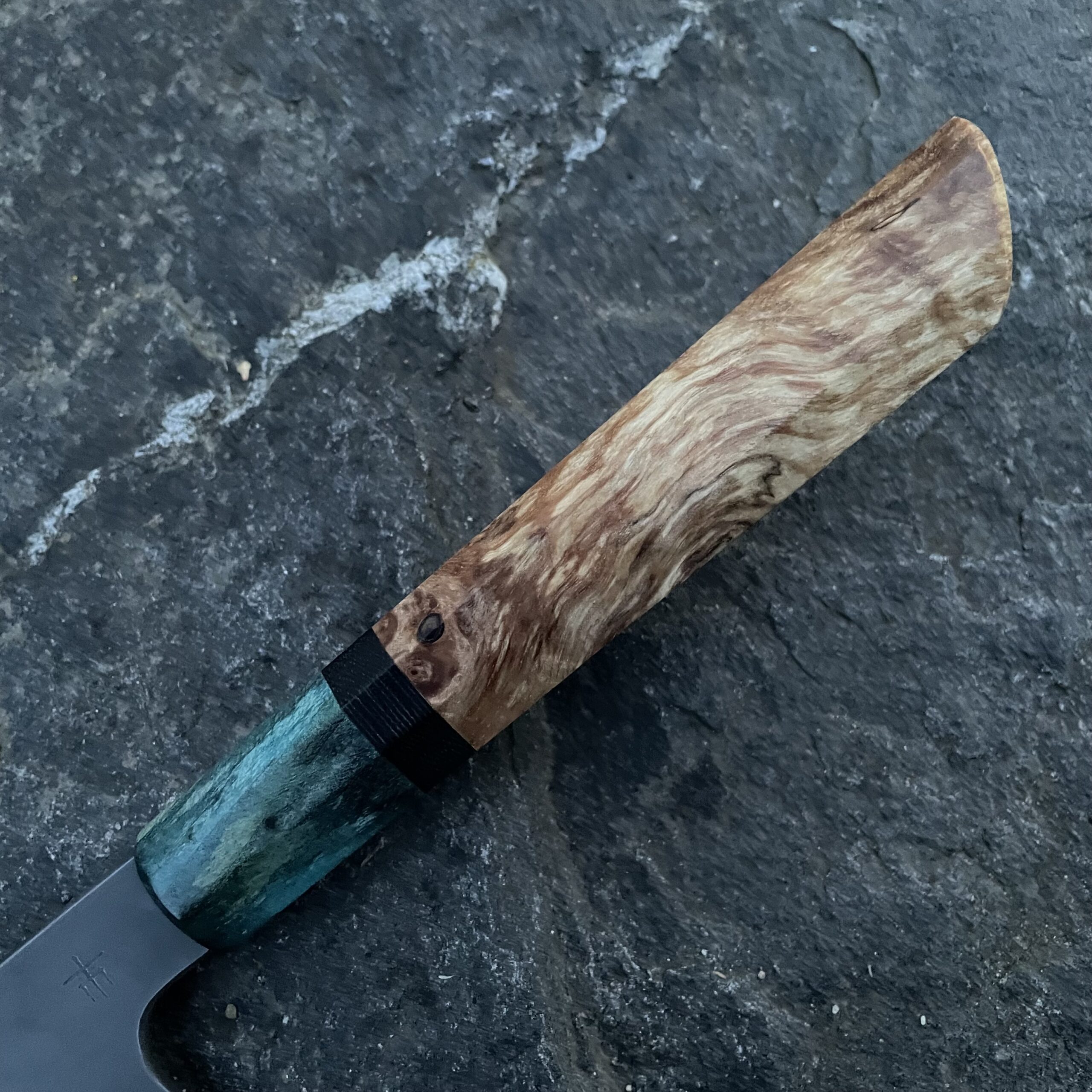 Rukojeť je vyrobena ze stabilizovaného dřeva, které je nejen esteticky zajímavé, ale také velmi odolné vůči vlhkosti a teplotním změnám. Nůž nevyžaduje žádnou speciální péči – po použití jej stačí opláchnout vodou a otřít do sucha. Pro udržení perfektní ostrosti doporučuji broušení na vodních kamenech. V případě potřeby mě neváhejte kontaktovat.