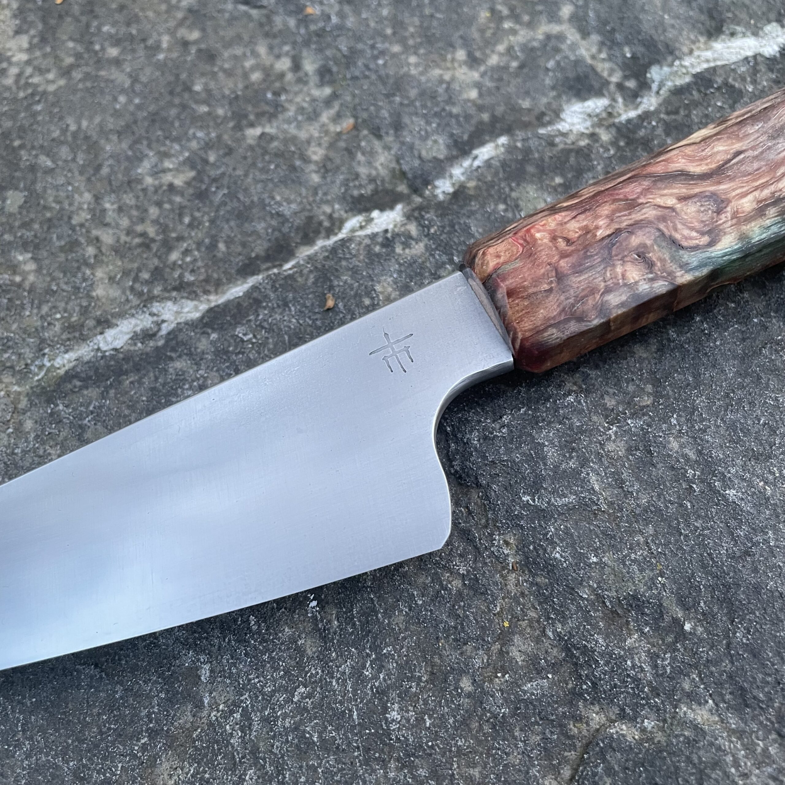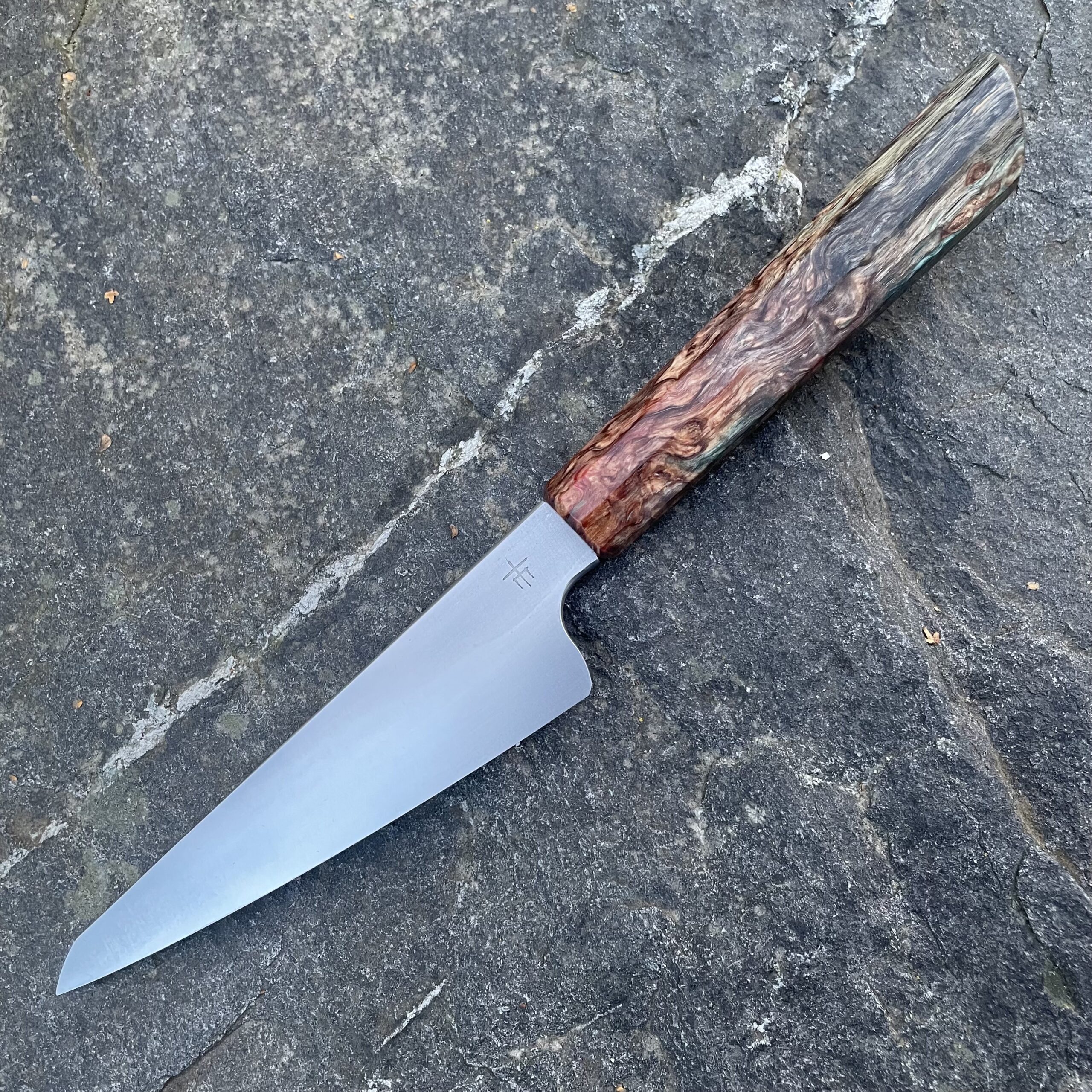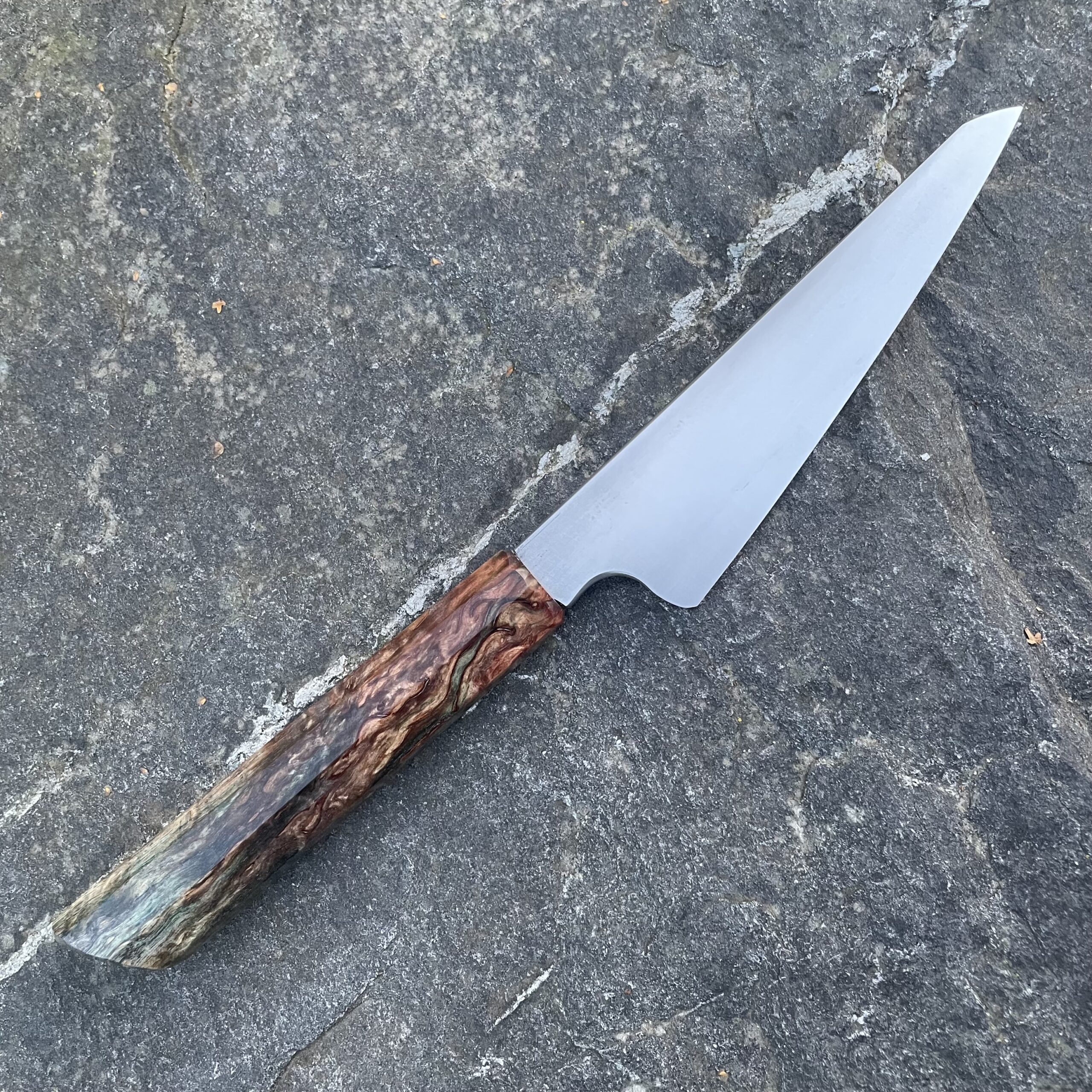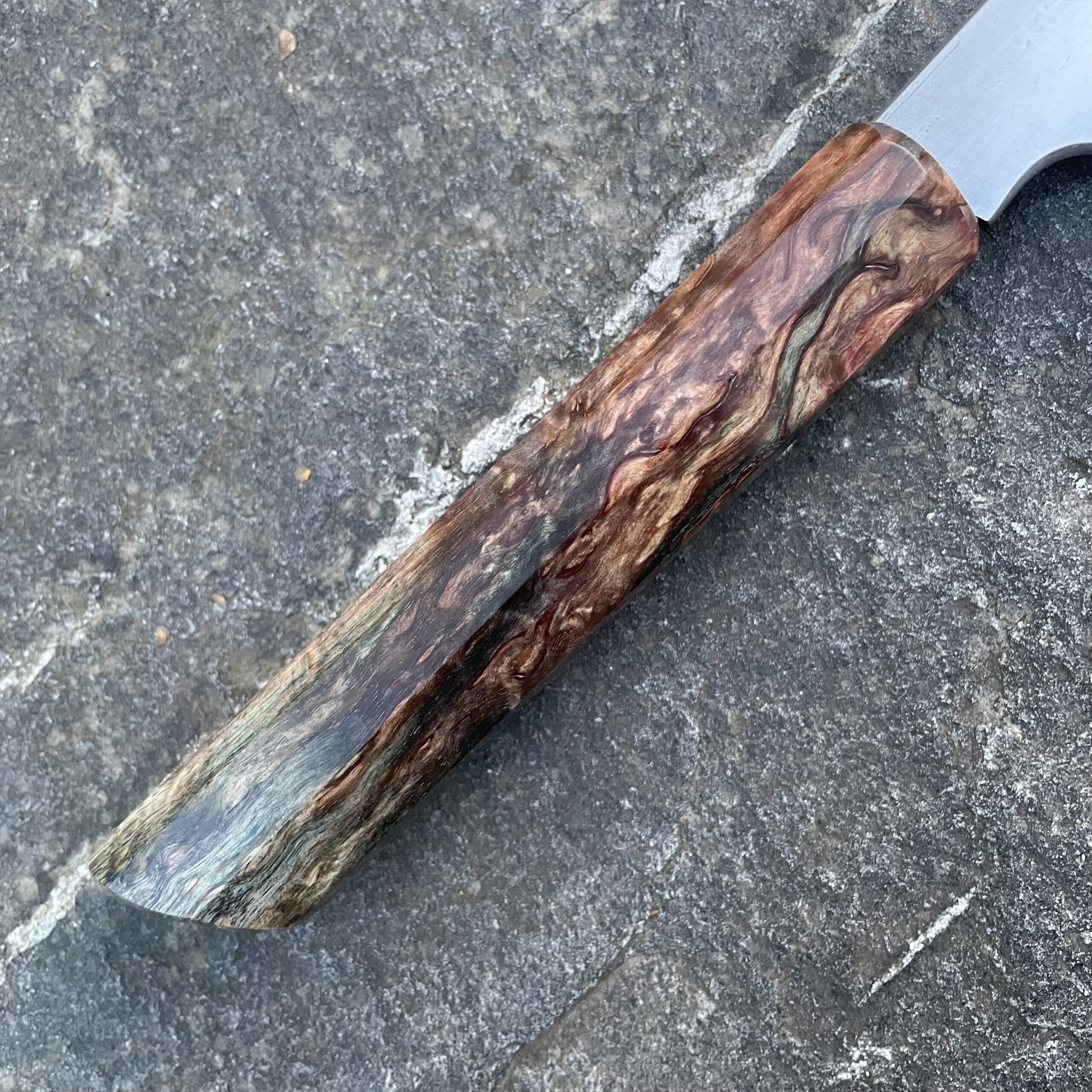 Rukojeť je vyrobena ze stabilizovaného dřeva, které je nejen esteticky zajímavé, ale také velmi odolné vůči vlhkosti a teplotním změnám. Nůž nevyžaduje žádnou speciální péči – po použití jej stačí opláchnout vodou a otřít do sucha. Pro udržení perfektní ostrosti doporučuji broušení na vodních kamenech. V případě potřeby mě neváhejte kontaktovat.