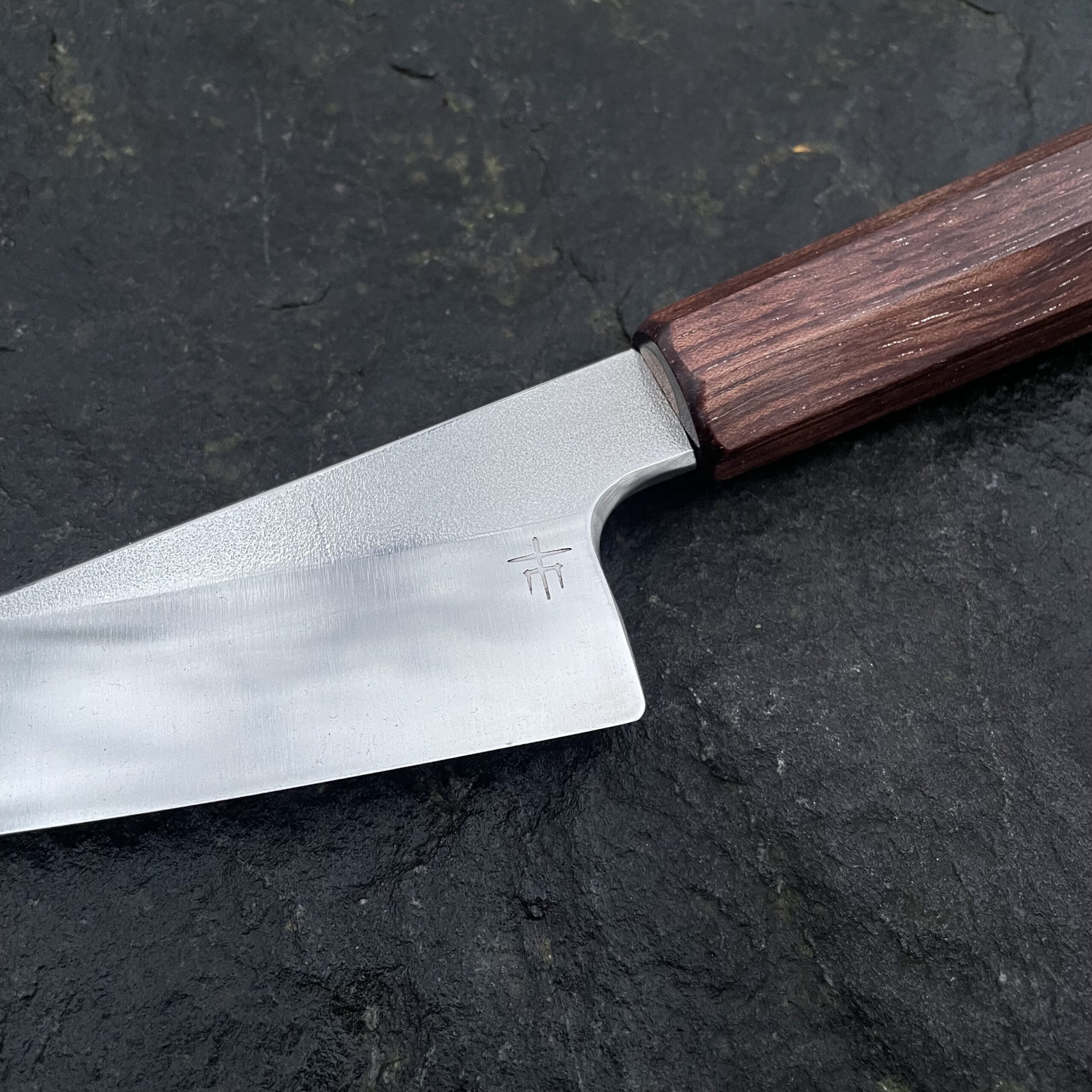 Rukojeť je vyrobena ze stabilizovaného dřeva, které je nejen esteticky zajímavé, ale také velmi odolné vůči vlhkosti a teplotním změnám. Nůž nevyžaduje žádnou speciální péči – po použití jej stačí opláchnout vodou a otřít do sucha. Pro udržení perfektní ostrosti doporučuji broušení na vodních kamenech. V případě potřeby mě neváhejte kontaktovat.
