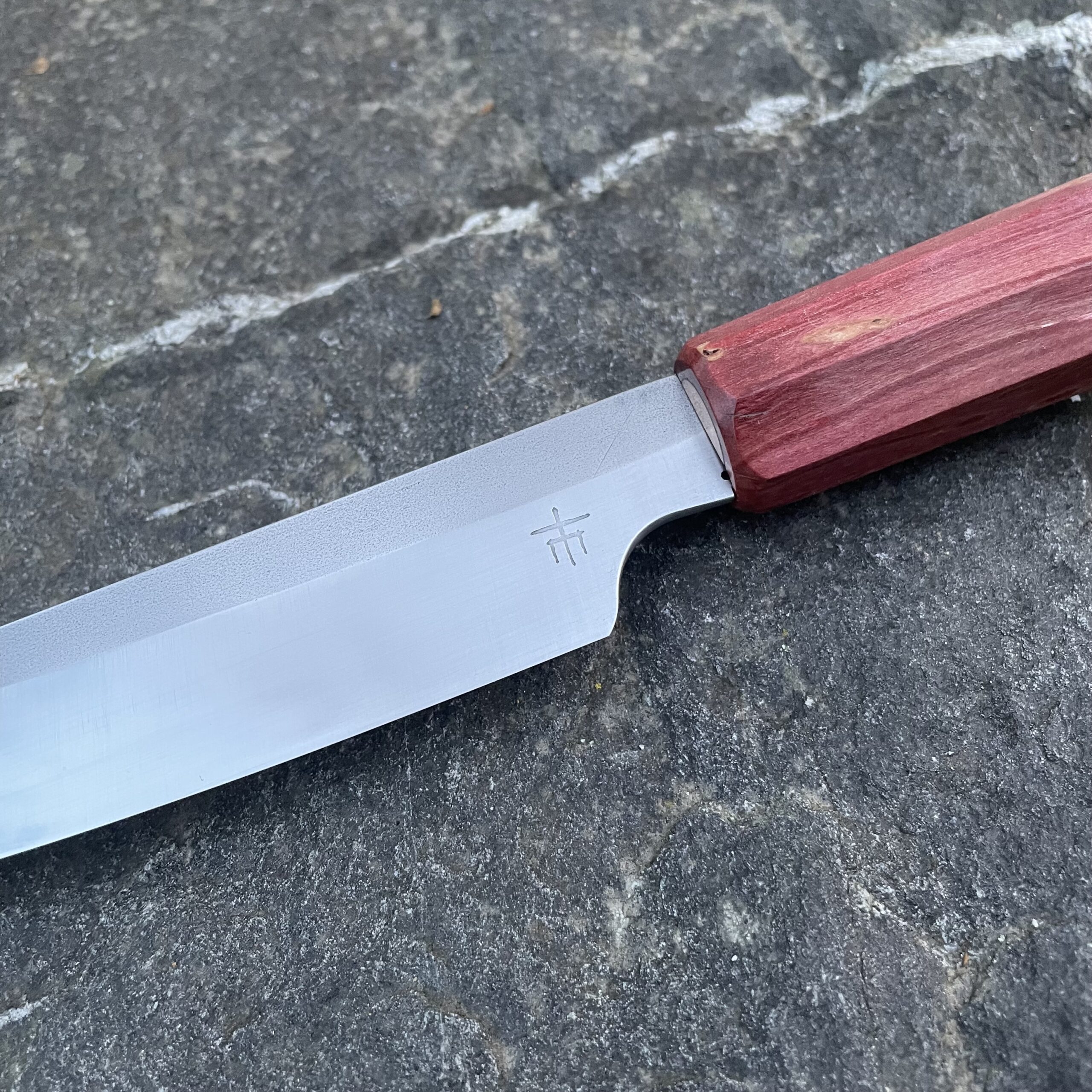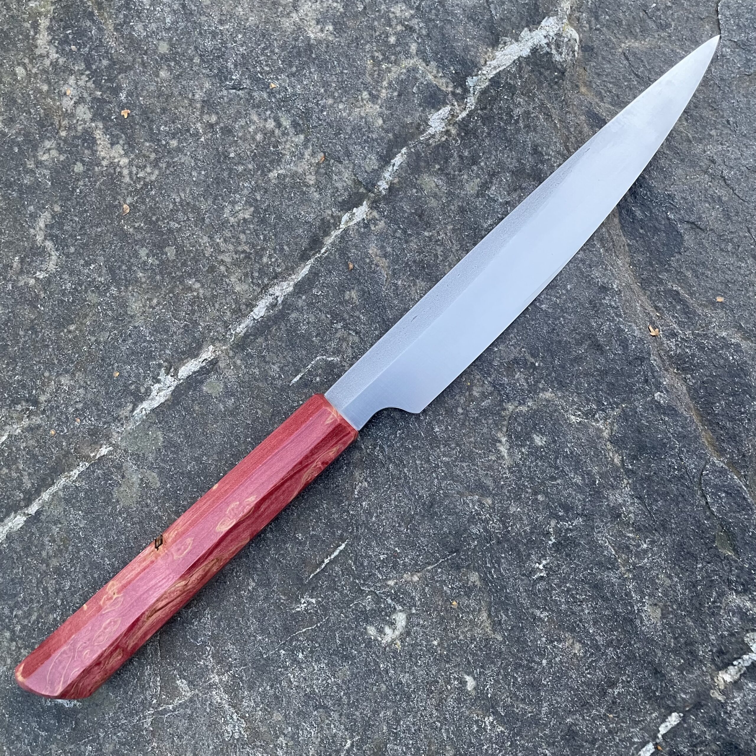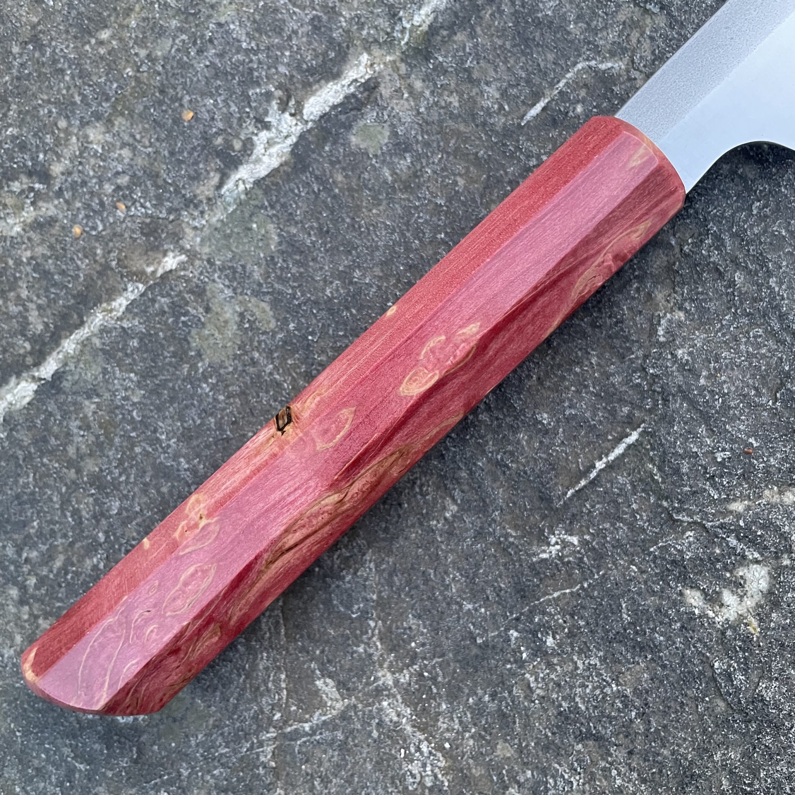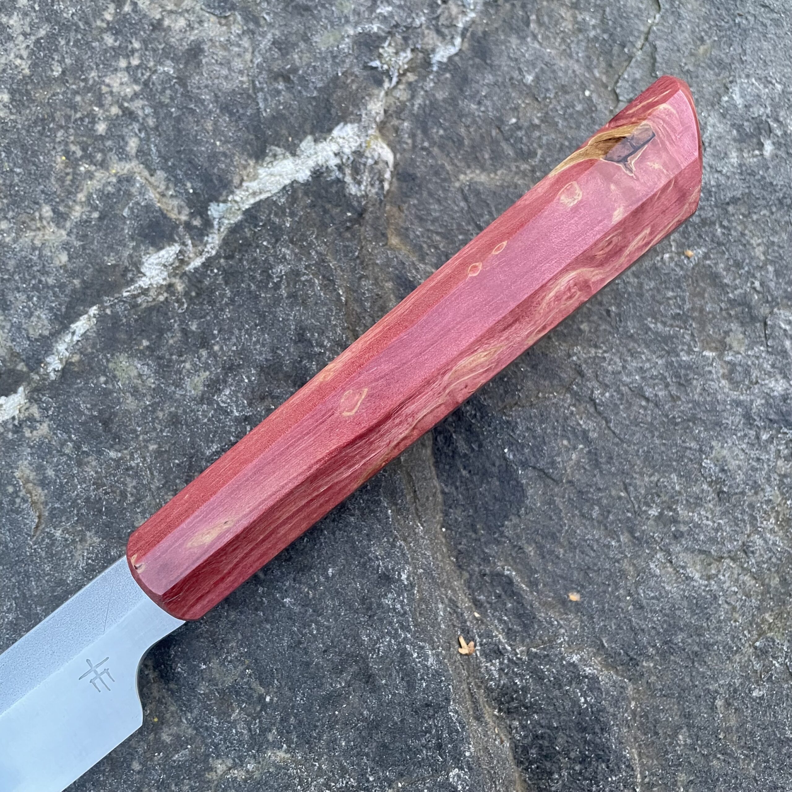 Rukojeť je vyrobena ze stabilizovaného dřeva, které je nejen esteticky zajímavé, ale také velmi odolné vůči vlhkosti a teplotním změnám. Nůž nevyžaduje žádnou speciální péči – po použití jej stačí opláchnout vodou a otřít do sucha. Pro udržení perfektní ostrosti doporučuji broušení na vodních kamenech. V případě potřeby mě neváhejte kontaktovat.